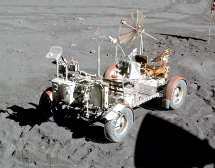 Here’s the same thing in photo: AS17-140-21354 from Apollo 17. Once again, no tracks. The rover had to have been lowered by a crane.