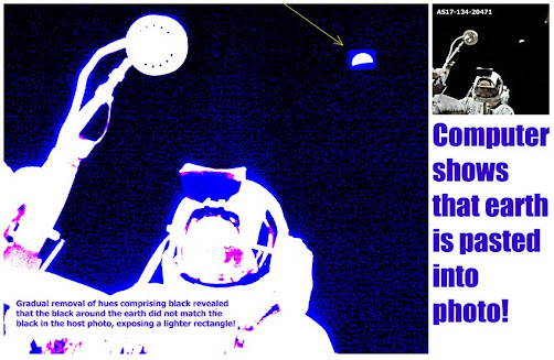 FACT: Moon pictures on NASA’s web sites are fake, with backdrop scenes pasted. The pictures reveal a black line penciled in where background meets daylight sky, which was blacked out completely.