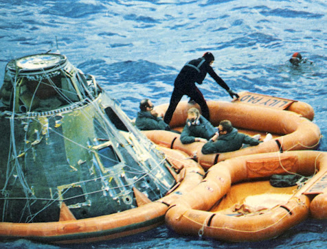 This one is incredibly funny! This is supposed to be the frogmen to rescue the Apollo men. Look at the fake “kite string” that is on top the the module. This is supposed to be the string that held the parachutes that brought the module to earth. I would think it would require heavy ropes for such a task. By the way, if this is same space module that brought the astronauts home then where is the area that they docked and climbed into the Lunar Module? Was it the same place? It had to be….but they also had to have the parachutes in the same place. So where are the parachutes in this photo? How was there room to get through the opening into the lunar module with the parachutes stored there? Also, look at the fake breathing respirators on their mouths so they wouldn’t spread “Moon germs” to the frog men. Okay, what about the “moon germs” that are inside the module? what about the “moon germs” on their body? Are those moon germs less threatening than what they might breathe out? Maybe since NASA can’t tell us how the Apollo men went to the bathroom for two weeks, We are thinking the frog men should have the gas masks on for any nasty stuff the Apollo men might have brought back! By the way, the “Apollo men” are on the rafts and have been for at least 10 minutes, what is the “frog man” still doing swimming in the ocean? Looking for the great white shark ? Or is he looking for a carp to eat tonight? Come on..AMERICA! Think about the B.S. these pictures are telling you!! (BELOW).